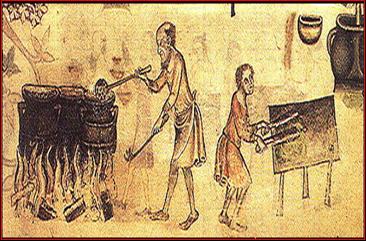 Poner el sofrito en una olla añadiendo los chorizos, la costilla, el lomo y 2 l. de agua. Salar el caldo, llevar a ebullición, tapar y dejar cocer a fuego lento unos 40 minutos. Añadir los pimientos asados y dejar cocer a fuego lento otros 10 minutos.