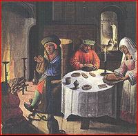 En una olla, poner a cocer las patatas en trozos de unos 2 cm. aproximadamente, la cebolla troceada, los pimientos rojos, los tomates y el bacalao hecho dos trozos.